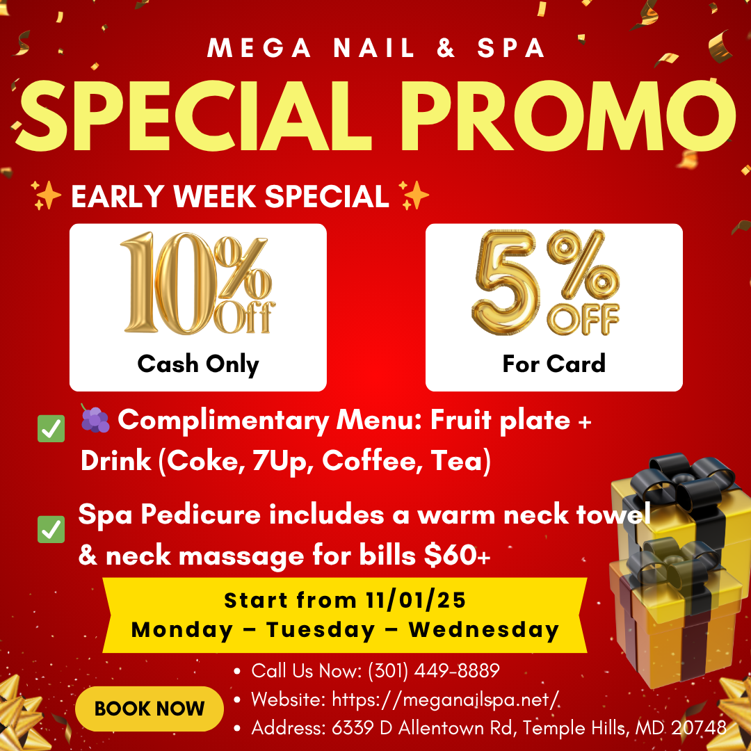 Come and experience our exceptional services at Mega Nail & Spa. Gift Certificate Available- Appointment & Walk-ins Welcome!